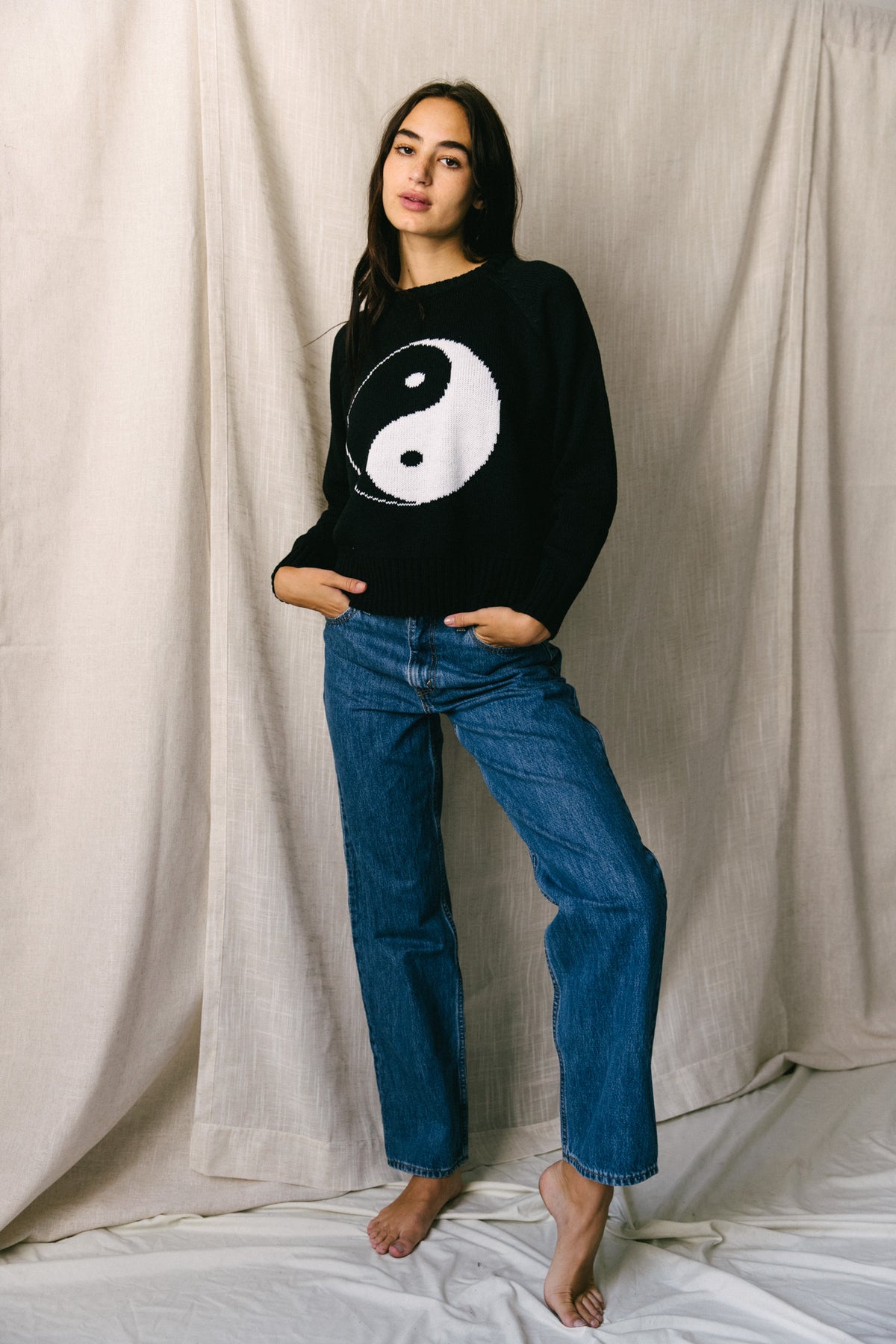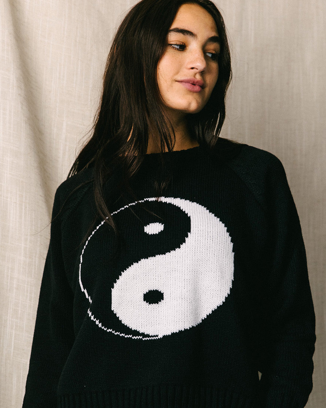 A medium-weight knit with a ribbed neck, hem, and sleeves, this piece is perfect for layering as sweater weather approaches. Made from yarn composed of recycled materials and featuring classic designs, this style is an effortless choice. In Chinese mythology, the yin-yang symbolizes the peaceful coexistence of light and dark throughout the universe.